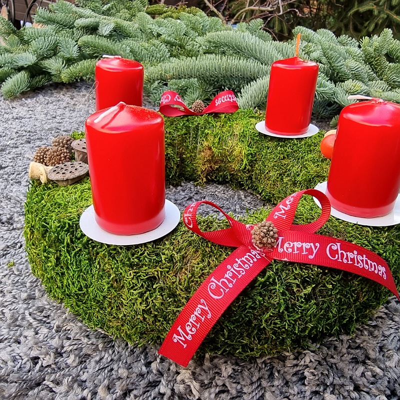 Materiál: Adventné sviečky, machový venček + mašličky + ostatné prírodné doplnky