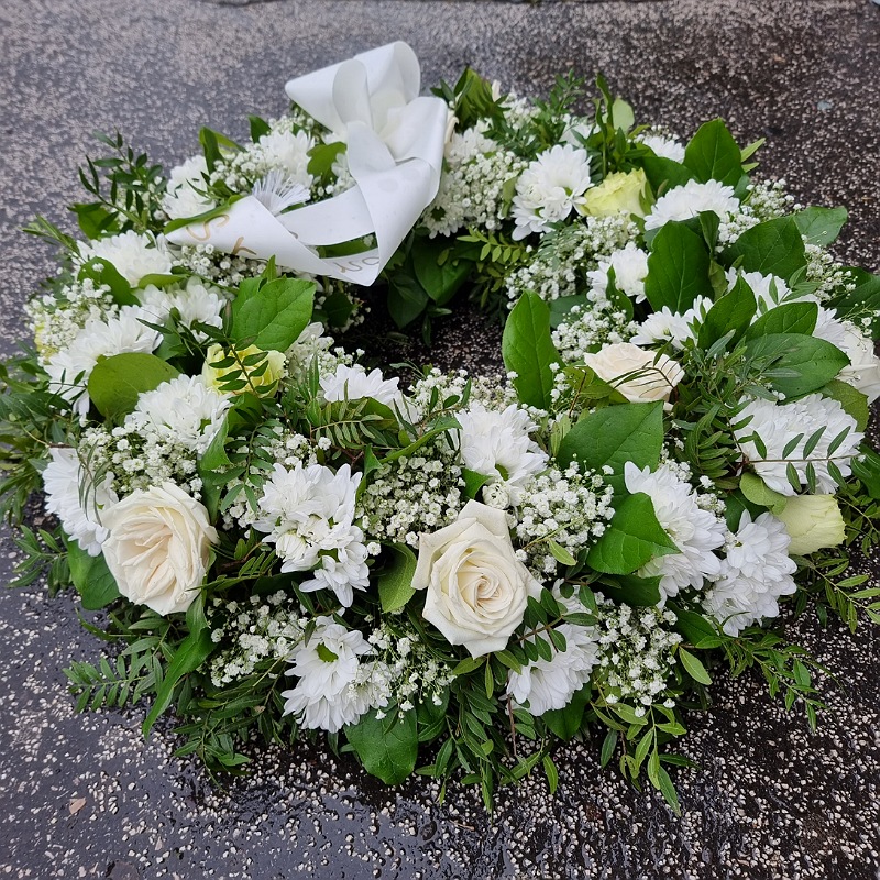 - Spomienkový veniec biele ruže, gypsomilka, santinky