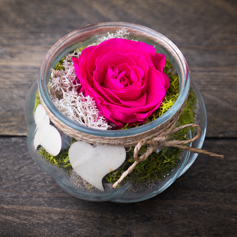 Dekorácia v skle so stabilizovaného machu a ružičky