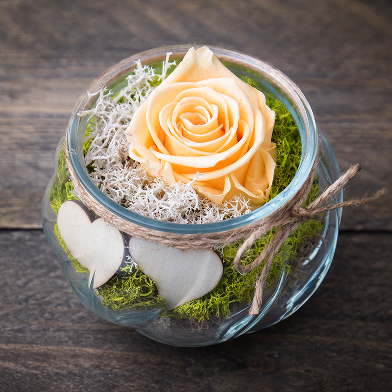 Dekorácia v skle so stabilizovaného machu a ružičky